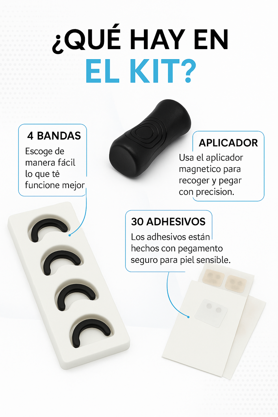 El kit incluye 4 tiras nasales magnéticas de diferentes niveles y diferentes tamaños, para adaptar a cualquier tipo de fosa nasal, trae su aplicador magnético e incluye 30 parches.